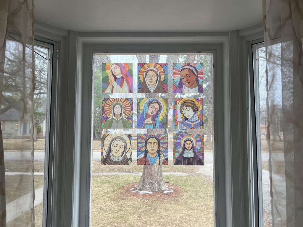 Product Details – Stained Glass Window Clings Each 6x6 inch cling features a vibrant stained glass image of one of nine beloved saints, including Saint Teresa of Avila, Saint Therese of Lisieux, Servant of God Thea Bowman, Saint Brigid of Ireland, Mary the Mother of God, Saint Joan of Arc, Saint Clare of Assisi, Saint Kateri Tekakwitha, and Saint Teresa Benedicta of the Cross. Made to stick to glass surfaces like windows and mirrors, these clings are a lovely addition to any home, office, classroom, favorite prayer spot or any space that just needs a little extra dose of inspiration. Whether you're using them for prayer, decoration, or just as a reminder of the saints who guide, protect us, and draw us closer to the heart of God, I hope these window clings bring you joy and comfort.